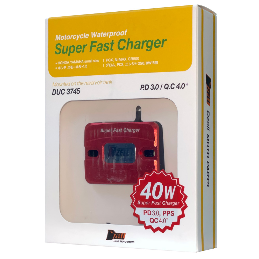 車両のブレーキマスターキャップと同形状のUSB給電ポート、急速充電対応。