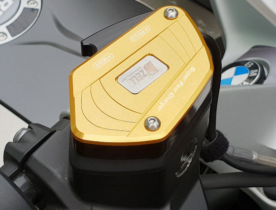 車両のブレーキマスターキャップと同形状のUSB給電ポート、急速充電対応(2ポート同時使用可)。