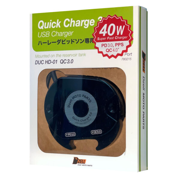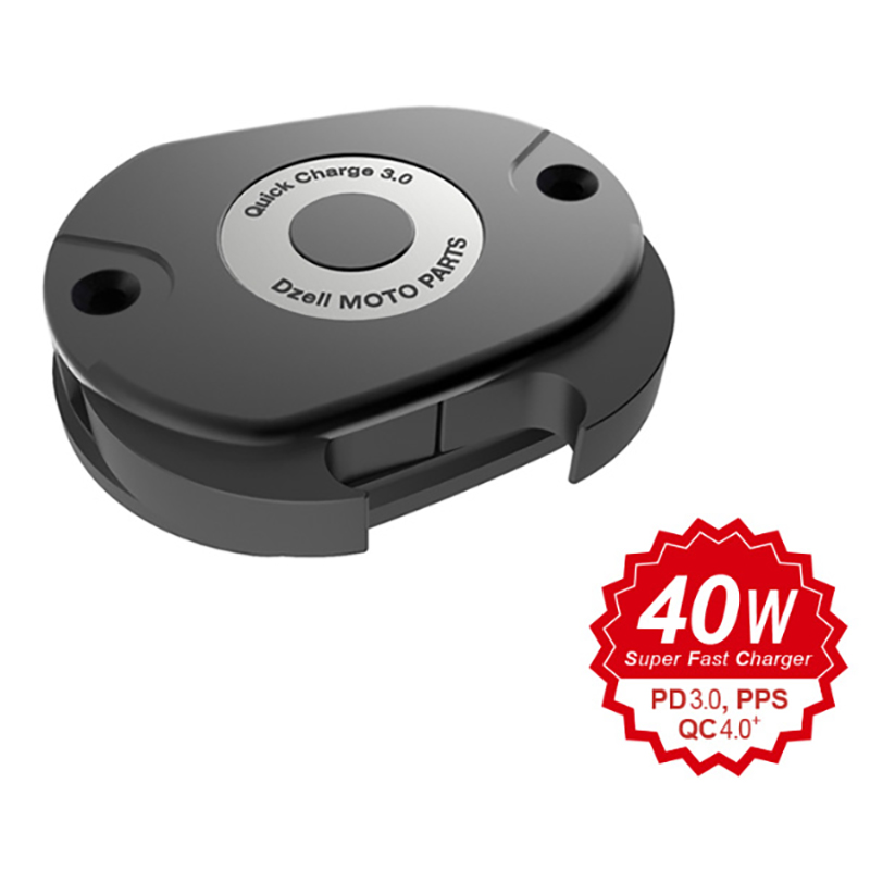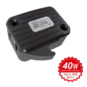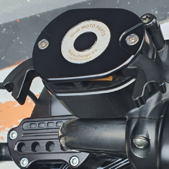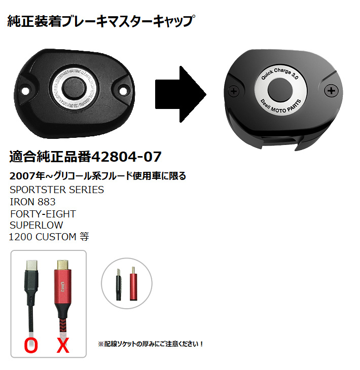 車両のブレーキマスターキャップと同形状のUSB給電ポート、急速充電対応(2ポート同時使用可)。