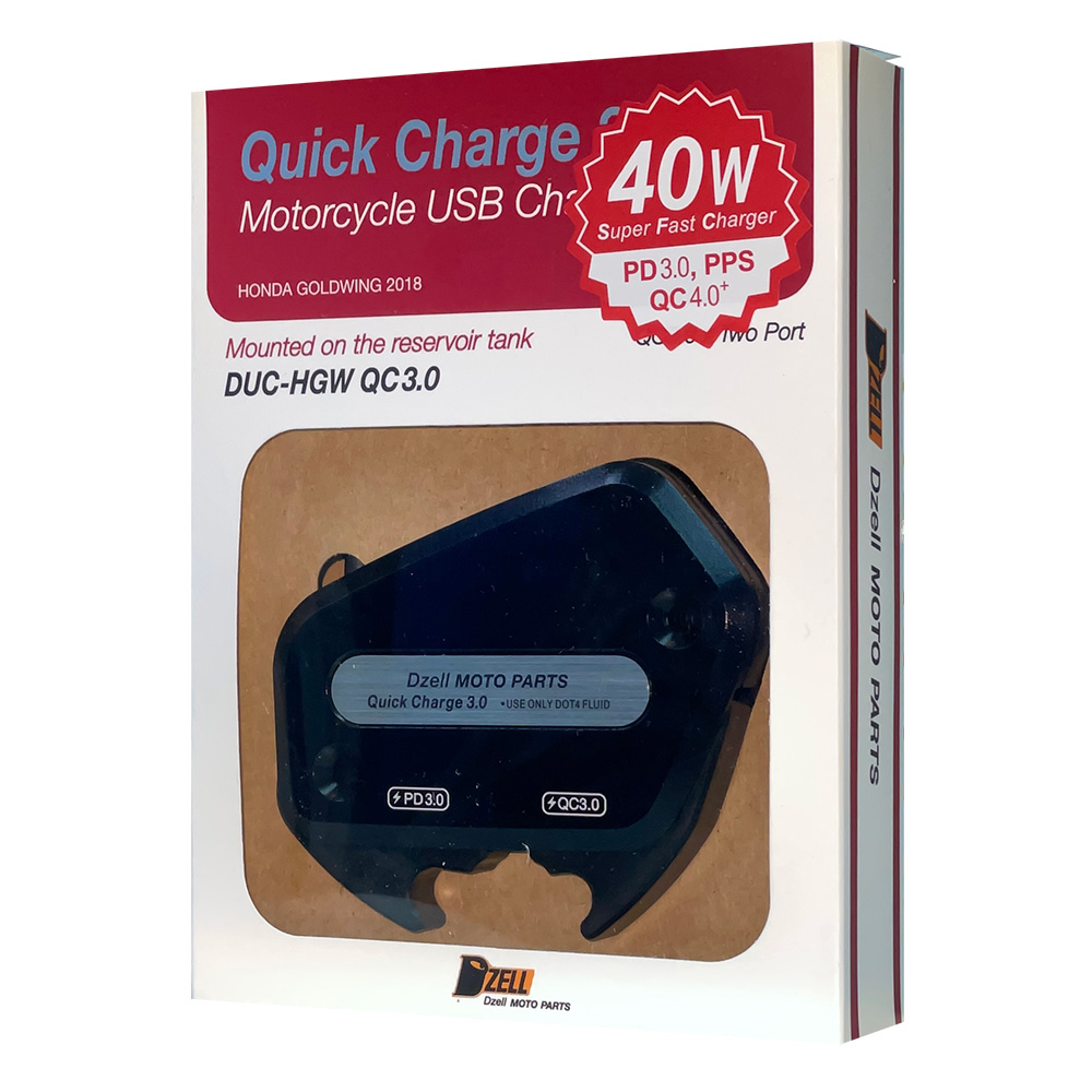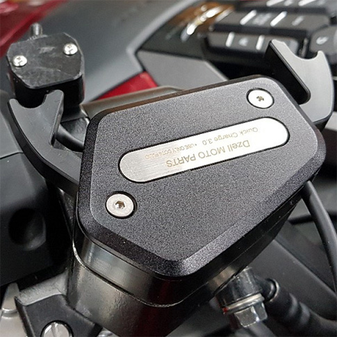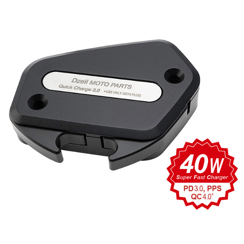 車両のブレーキマスターキャップと同形状のUSB給電ポート、急速充電対応(2ポート同時使用可)。