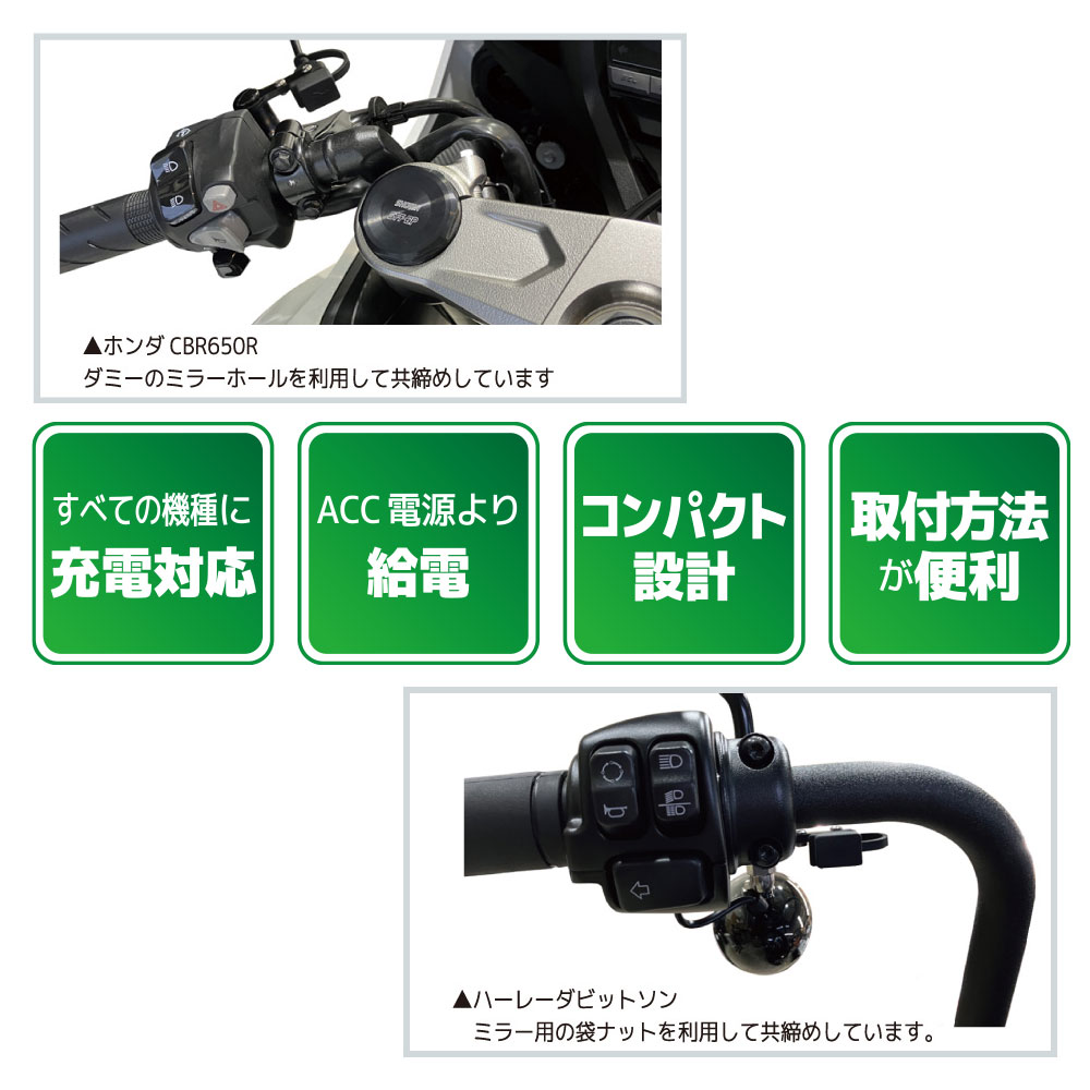 CT ミラーマウントUSBミニチャージャー タイプC¥5,720 税込 ・ネイキッドのミラーと共締めでしっかり固定! ・PD対応のタイプCでパワフル充電! ・メインパーツはMADE IN JAPAN! ・変圧器内にも安全機能搭載 在庫あり CT ミラーマウントUSBミニチャージャー タイプC個 お買い物カゴに追加 商品コード: 790003 カテゴリー: USBチャージャー タグ: USBポート, USB充電器 説明 仕様 レビュー (0) 説明 ユニットは完全防水です。 ゴムキャップ閉時は防水です。 クランプは車種に合わせて差替えできます。 仕様 車体側対応電圧 12V~24V 対応充電規格 USB PD(パワーデリバリー)USBtype-C ※急速充電に対応していないデバイス機器では急速充電できません。 出力定格電流 5V3A / 9V2A / 12V1.5A 出力定格電圧 18W 製品保証期間 お買い上げ日より2年 レビュー レビューはまだありません。 以前にこの商品を購入したことのあるログイン済みのユーザーのみレビューを残すことができます。 関連商品 USB TWOポート HD-01(タイプC PD3.0/QC4.0) ¥17,050 税込 続きを読む USB TWOポート ゴールドウイング(タイプC PD3.0/QC4.0) ¥17,050 税込 続きを読む USB TWOポートY/B(タイプC PD3.0/QC4.0 レッド) ¥13,200 税込 続きを読む USB TWOポートY/B(タイプC PD3.0/QC4.0 ゴールド) ¥13,200 税込 続きを読む