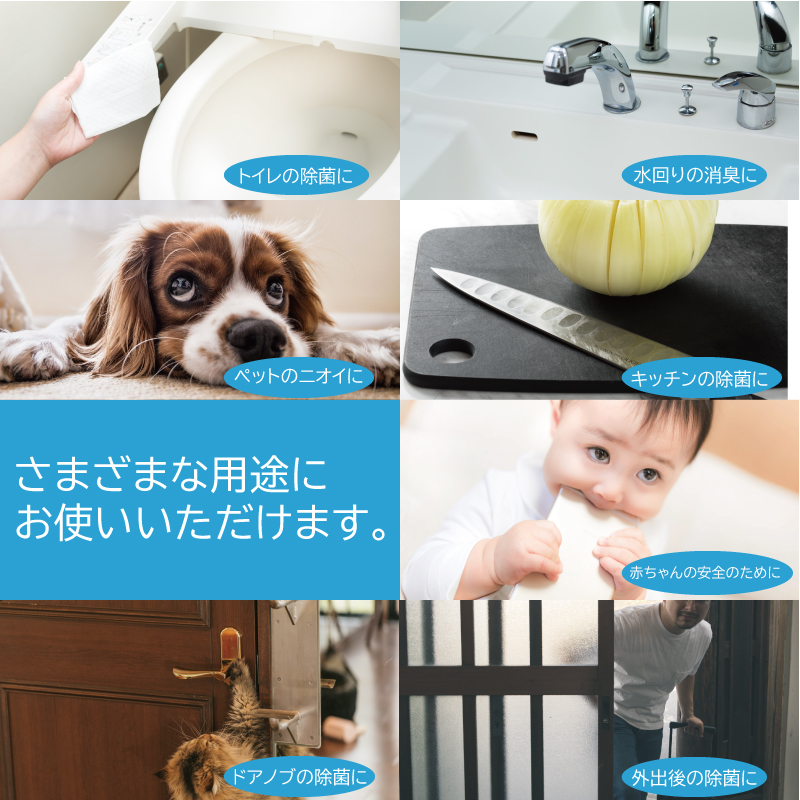 • 床、壁、テーブル、ドアノブなどの除菌
